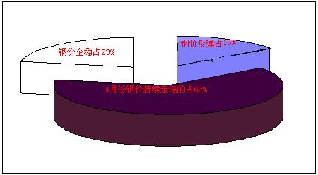 廠家市場調(diào)研情況來看,如下圖所示:對于4月鋼材行情都持不懂看法,其中認為“鋼價能有小幅反彈”的占15%,“鋼價會延續(xù)下跌”的占62%,“鐵價逐漸企穩(wěn)”的占23%。由此可見,過半數(shù)廠家對后市預期仍較悲觀,而且3月之前鋼價的反彈并沒有給廠家?guī)矶啻蟮男判模^續(xù)看跌的商家較4月初有所增加,最近鋼材市場有降價走勢,漲缺乏實質(zhì)性需求支撐,動力不足,而受低庫存及高成本支撐,下跌難有空間。短期來看,熱軋價格就這么弱勢維持。